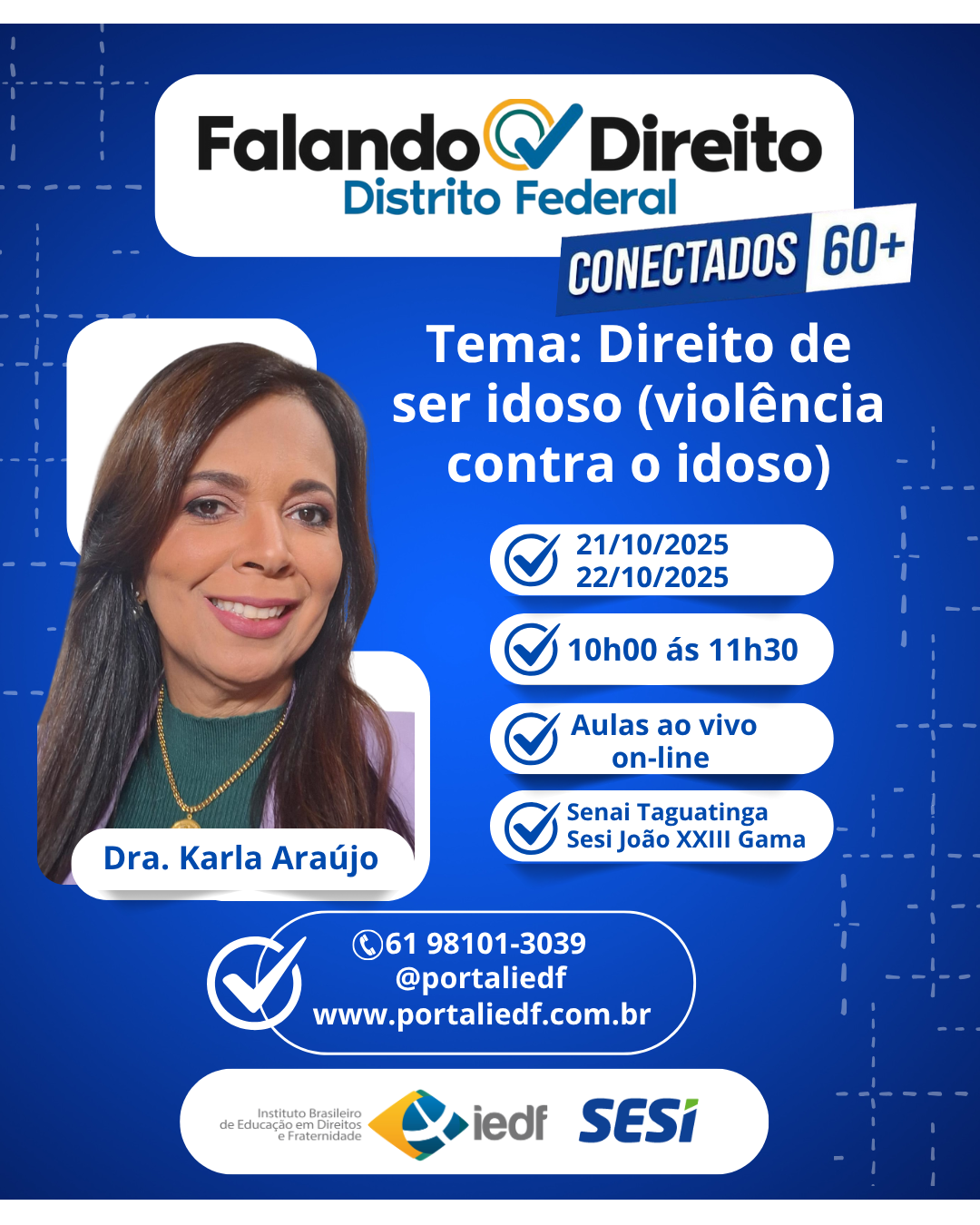 O Instituto Brasileiro de Educação em Direitos e Fraternidade (IEDF), em parceria com o Serviço Social da Indústria (SESI), dá início a novas turmas do projeto Falando Direito e Conectados 60+, voltado à promoção da cidadania e da educação em direitos para o público idoso. As aulas começam nesta terça-feira